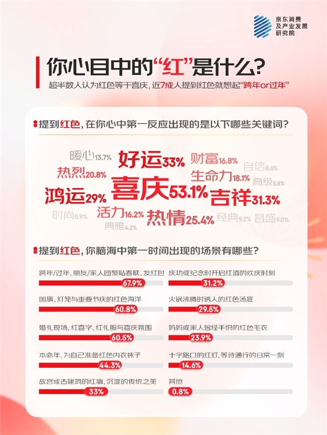 人的审美基因里是经久不衰的为什么是血色?血色正在中国,的节日气氛有着浓浓。为血色的基因是喜庆53.1%的人认,1.3%)、是隆运(29.0%)是好运(33.0%)、是平安(3;表此,(20.8%)和性命力(18.1%)血色还败露着热忱(25.4%)、热闹。以所,年特地计算穿红/用红超六成的人都市正在跨,种文明的传承这不单仅是一,的情绪典礼感更是一种踊跃,信念和能量为新年注入。