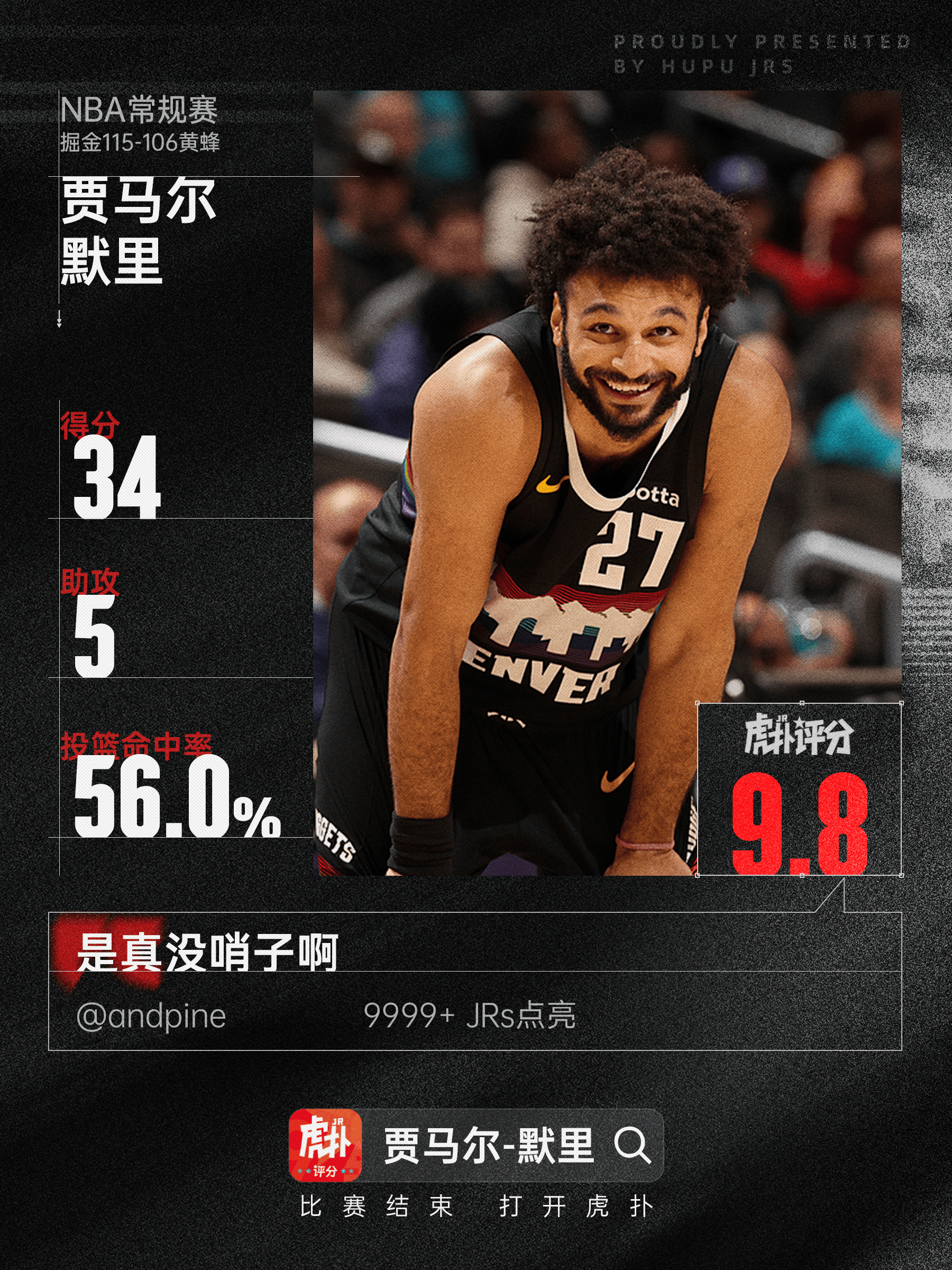 竞赛本场,默里出战35分钟掘金球员贾马尔-,14中25投,球9投2中个中三分,投4中罚球434分3篮板5助攻1抢,板5帮攻1抢断取得34分3篮。